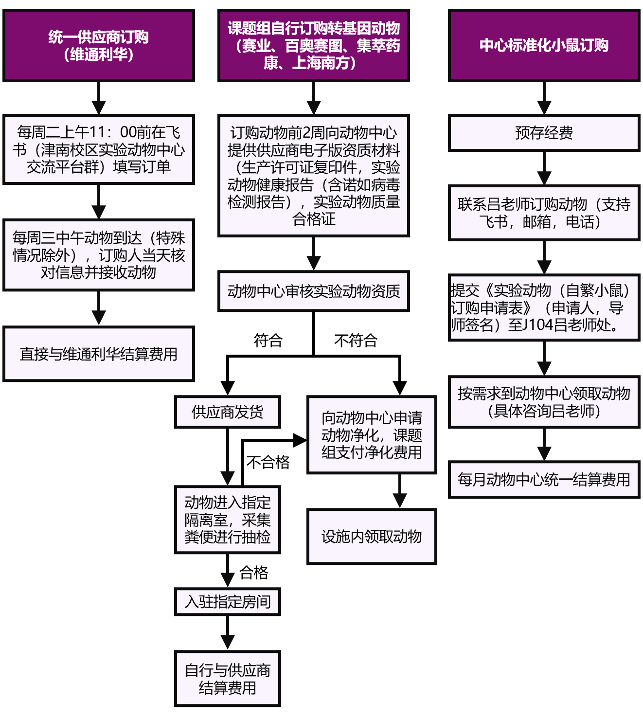 ◆非统一供应商订购:可选供应商:赛业、百奥赛图、集萃药康、上海南方。须提前至少2周申报,并提供供应商资质电子版材料(生产许可证复印件,实验动物健康报告(含诺如病毒检测报告),实验动物质量合格证。收到动物后存放至指定检疫隔离室,并采集粪便交给动物中心毛老师进行抽检,抽检合格后转入指定房间饲养。