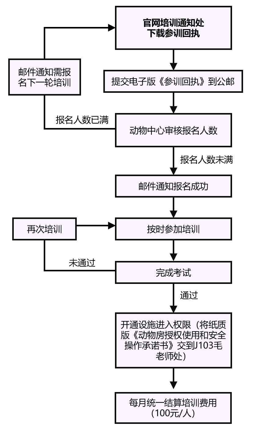 | 3 | 参加设施准入培训 | 实验动物中心 | 实验开展前必须完成 |
