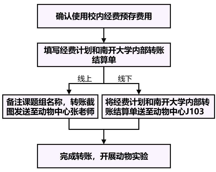 ◆通过南开大学财务系统(内网)预存实验费用需填写《经费使用计划表》和《南开大学内部转账结算单》(见南开大学财务系统)。若从线上走内转流程,则需备注课题组名称,并将转账截图发送给动物中心张老师;若走线下内转流程,需将《经费使用计划表》和《南开大学内部转账结算单》送至动物中心J103张老师处。